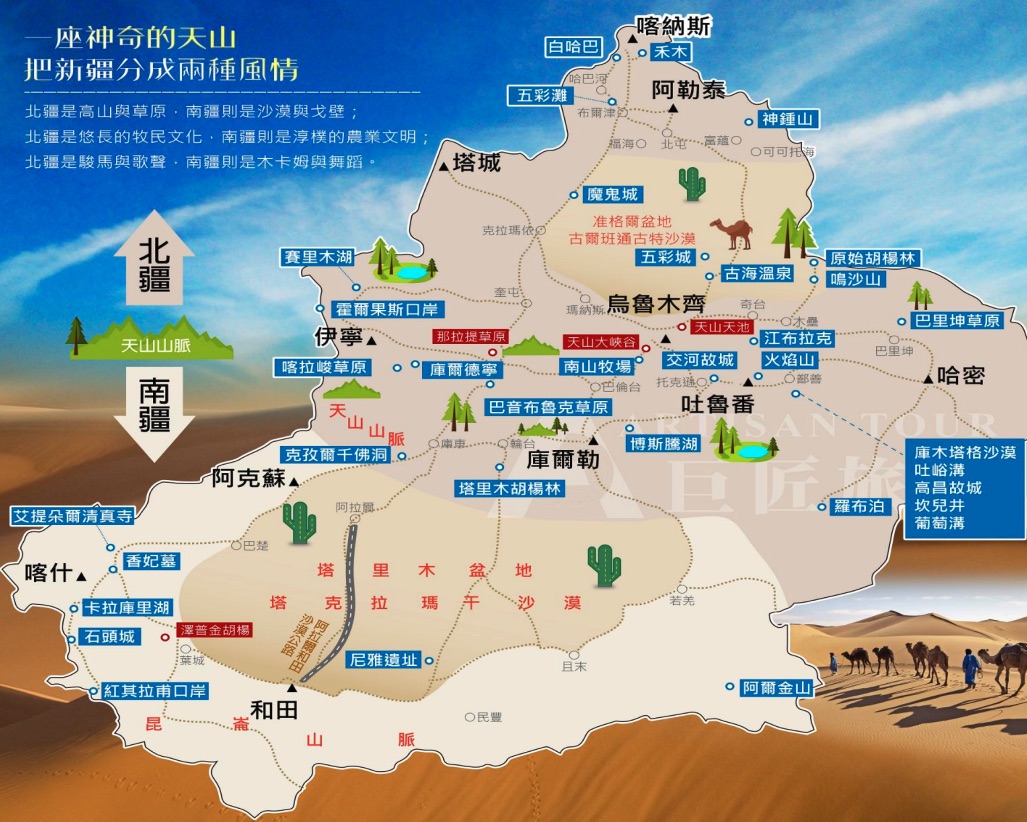 新疆分為南疆和北疆,氣勢雄偉的天山山脈從東到西橫亙在中部,天山以南為南疆,以北則為北疆,因為新疆幅員遼闊,所以一般來新疆旅行的朋友時間有限的話,都會選擇只玩南疆或者北疆,因為如果全程細細遊玩的話,基本要20天左右。北疆旅遊