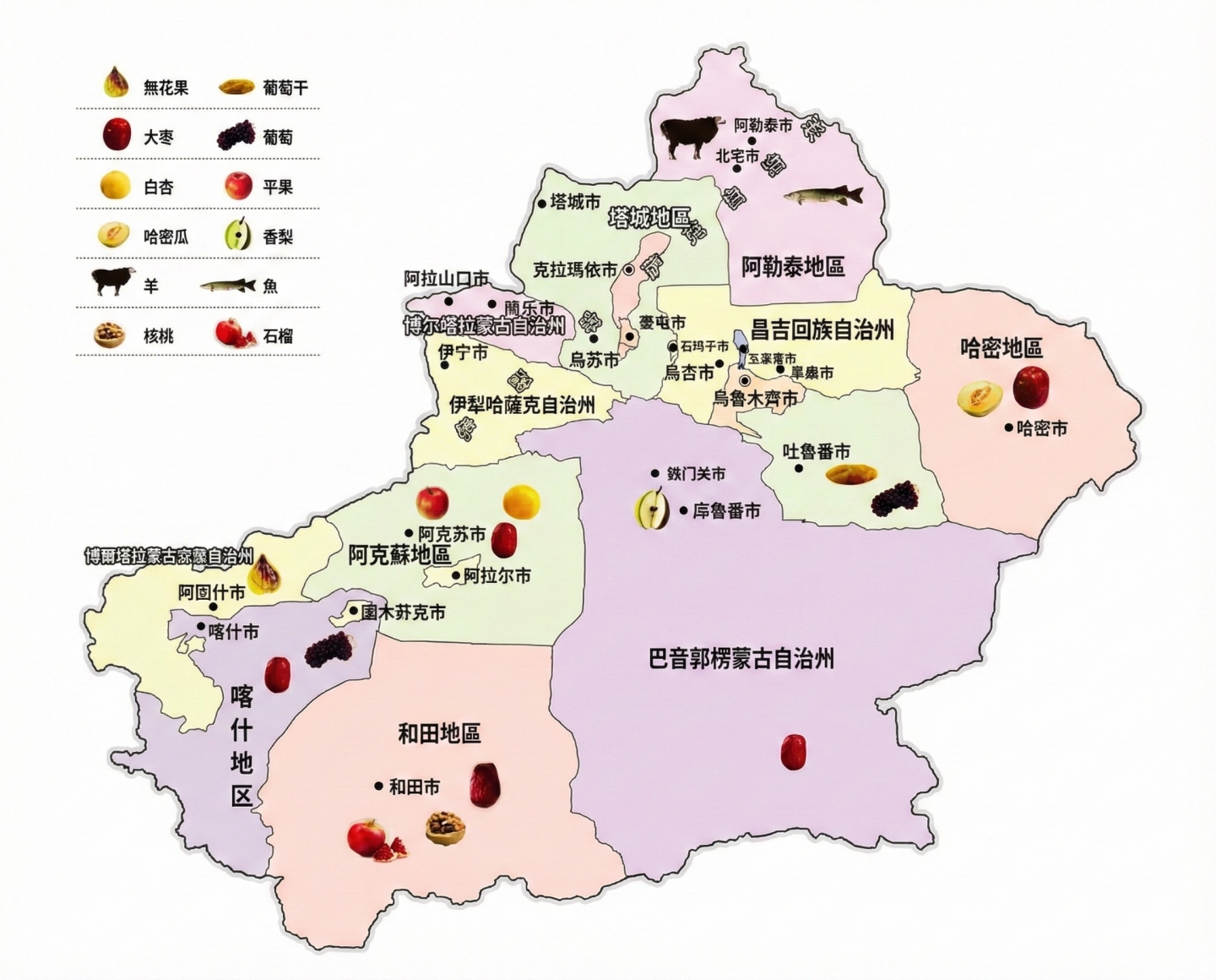 在新疆的民間人民之間流行著一首”民謠歌“的,對新疆 不同地區的不同瓜果進行闡釋: