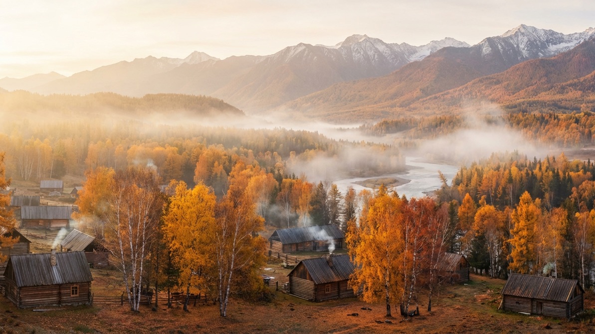 這絕對是禾木顏值的巔峰!每年 9 月 16 日至 30 日被稱為「黃金 15 天」。漫山遍野的白樺林瞬間變成金黃色,與深綠的泰加林交織,清晨的炊煙與晨霧在陽光下丁達爾效應拉滿,是無數攝影師的夢想之地。